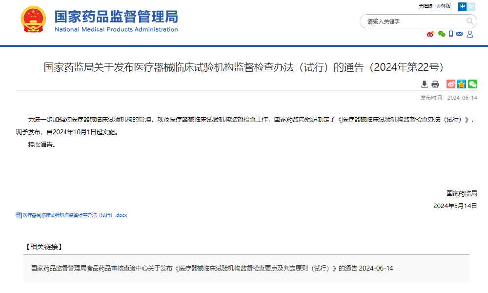 國(guó)家藥監(jiān)局關(guān)于發(fā)布醫(yī)療器械臨床試驗(yàn)機(jī)構(gòu)監(jiān)督檢查辦法(試行)的通告(2024年第22號(hào))為進(jìn)一步加強(qiáng)對(duì)醫(yī)療器械臨床試驗(yàn)機(jī)構(gòu)的管理,規(guī)范醫(yī)療器械臨床試驗(yàn)機(jī)構(gòu)監(jiān)督檢查工作,國(guó)家藥監(jiān)局組織制定了《醫(yī)療器械臨床試驗(yàn)機(jī)構(gòu)監(jiān)督檢查辦法(試行)》,現(xiàn)予發(fā)布,自2024年10月···